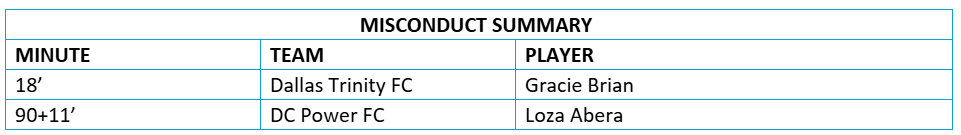 DC Power FC Lineup: Morgan Aquino, Susanna Fitch, Paige Almendariz, Madison Murnin, Sydney Cummings, Ellie Gilbert (Dasia Torbert 90+7’), Katie Duong (Katrina Guillou 66’), Anna Bagley (Loza Abera 66′), Gianna Gourley, Jaydah Bedoya (Claire Constant 90+3’), and Alexis Theoret.