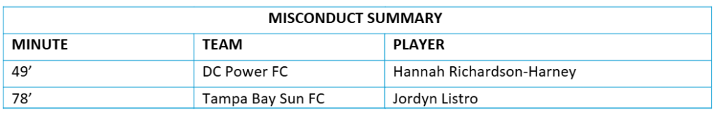 Tampa Bay Sun FC Lineup: Liz Beardsley, Taylor Chism, Sabrina McNeill (Victoria Haugen 75’), Vivianne Bessette, Brooke Hendrix, Jordyn Listro (Faith Webber 88’), Sydny Nasello (Jordan Zade 75’), Gabby Provenzano, Jillian Shimkin (Sandrine Mauron 76’), Jordan Fusco (Carlee Giammona 75’), Madison Parsons.