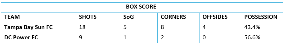 Tampa Bay Sun FC (1-6-9, 12 PTS) 1 vs. 1 DC Power FC (4-5-7, 19 PTS)
