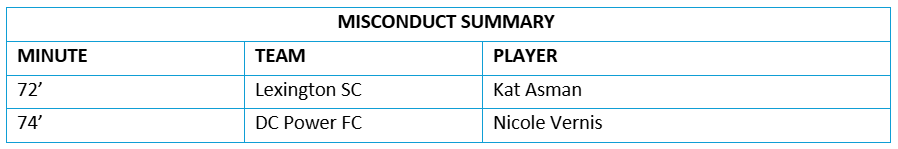 DC Power FC Lineup: Morgan Aquino, Paige Almendariz, Madison Murnin, Sydney Cumming (C), Claire Constant, Hannah Harney ((Valentina Perrotta 55’)( Lexi Fraley 83’)), Anna Bagley, Emily Colton, Justina Gaynor, Loza Abera (Dasia Torbert 79’) and Alyssa Walker (Jaydah Bedoya 79’).