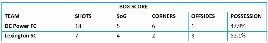 DC Power FC (6-8-8, 26 PTS) 0 vs. 2 Lexington SC (10-2-10, 40 PTS)
