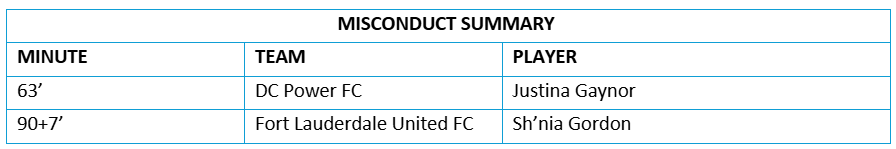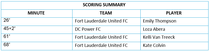 Fort Lauderdale United FC Lineup: Haley Craig, Julia Grosso, Laveni Vaka, Maggie Mace, Sh’nia Gordon (C), Shea Moyer, Kat Gonzalez (Taylor Smith 75’), Kelli Van Treeck, Abi Hugh, Emily Thompson (Kate Colvin 65’) and Kiara Locklear.